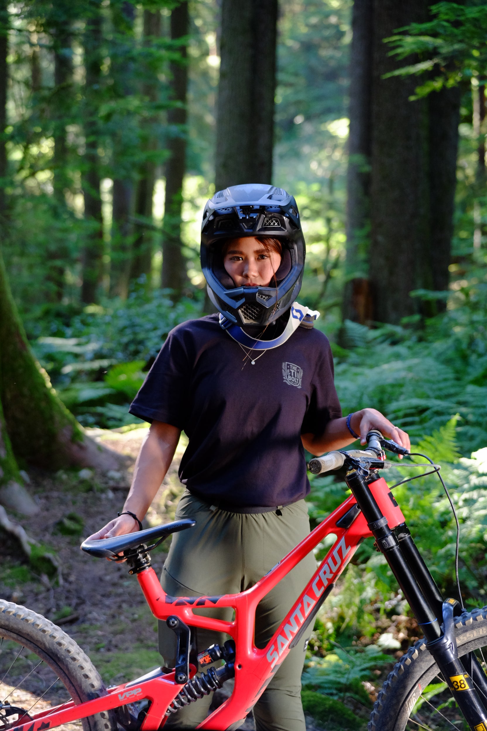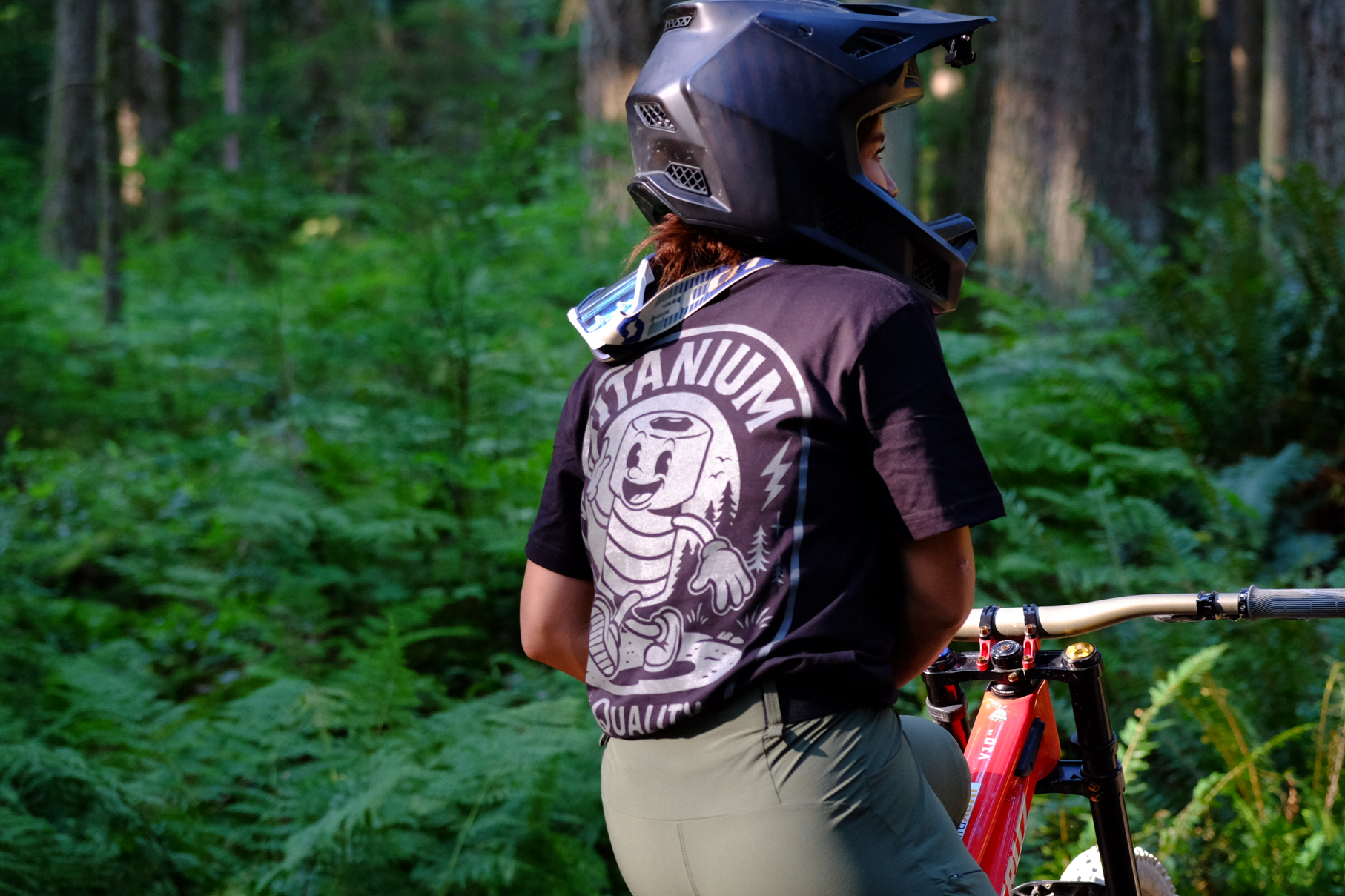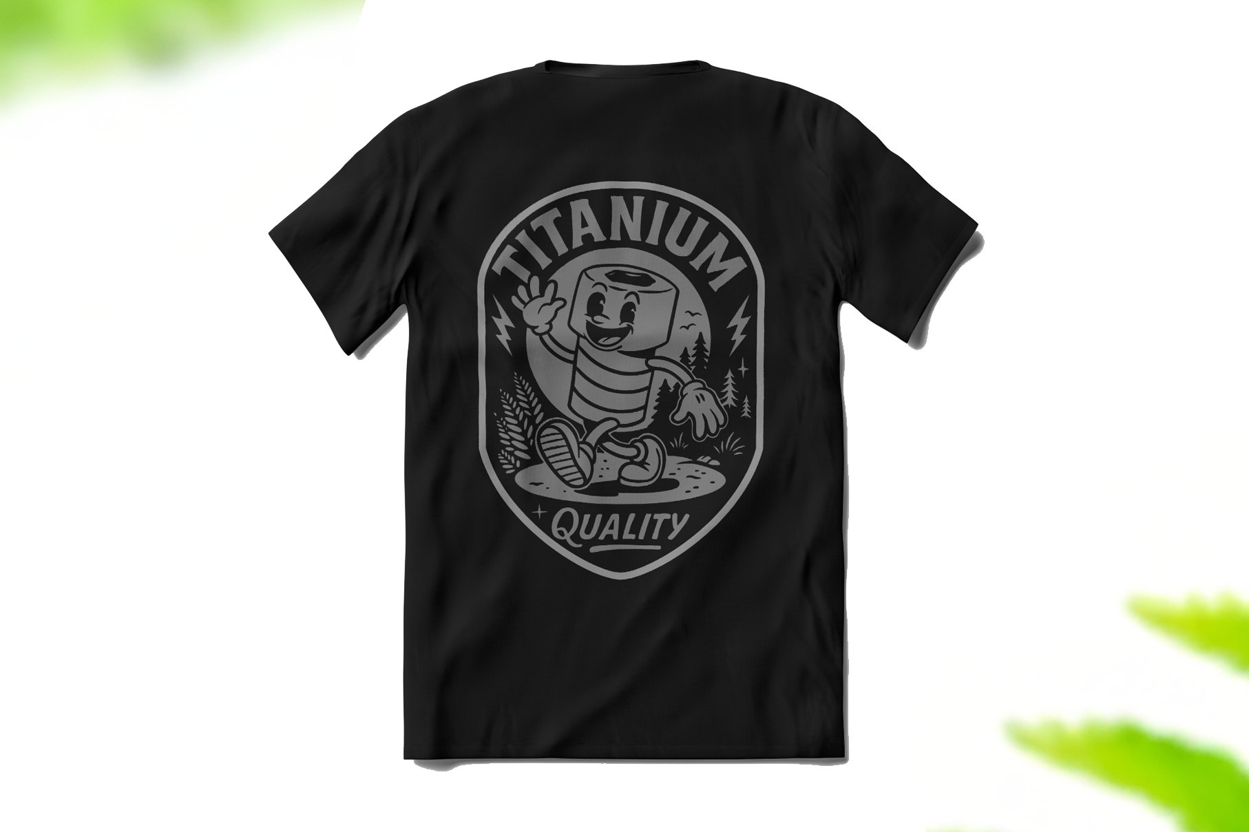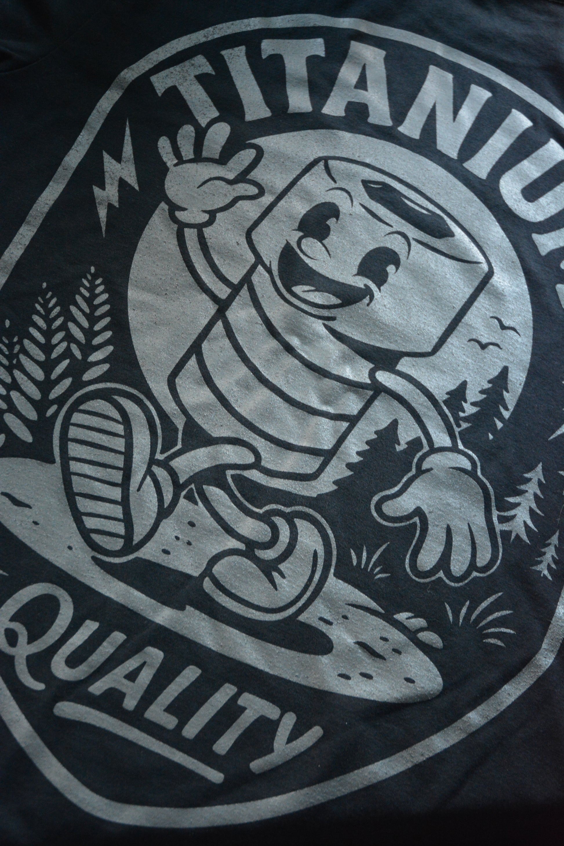 Our smiley, friendly titanium bolt mascot is now immortalized on fabric. Surrounded by ferns and forest, printed back and center on this ultra-limited shirt.